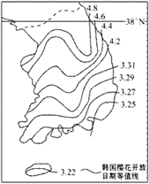 1、单选题 读某国樱花开放日期等值线图,回答下列各题。