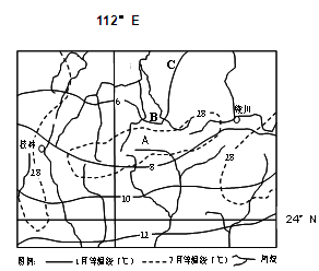 小题1:从图中水系特征可以看出A处是分水岭,海拔比周围高,气温比周围低,所以A处气温7月:26℃<T<28℃,1月:6℃<T<8℃,因此可以算出A处气温年较差的范围是18℃<△T<22℃,故A项正确;B处等温线凸向高值,根据等值线“凸高为低”的规律,B处应该温度偏低;C处等温线大致东北—西南走向,主要是受地形因素作用的结果;1月的等温线比7月密集,主要是受太阳辐射因素的影响。