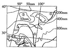 小题3:相邻两条等值线相等或相差一个等值距。A附近为200mm和400mm的等值线,A地为位于河西走廊祁连山脉的迎风坡,降水较多,所以应为400mm。所以本题选择C选项。