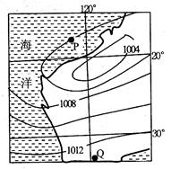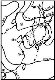 5、单选题 读某地区海平面等压线分布图,回答下列各题。