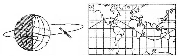 小题2:该卫星绕地球运动的周期是90分钟。从上述时间开始,该卫星连续飞行四圈后,右图中最靠近晨线的城市是: