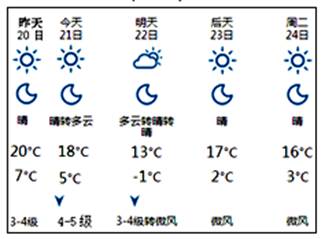 5、单选题 下图为某地2015年3月21日发布的天气趋势图。图中数据分别表示当日最高和最低气温,读图,回答下列各题。