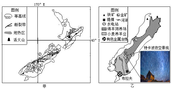 材料一:图甲为“新西兰南北二岛地形图”,、图乙为“新西兰南岛简图”图丙为图甲中①、②两地的气候统计图。