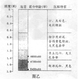 (2)图乙所示地层,埋藏越深,距今年代越__________;深度1.6米处是___________沉积,由此可推断该地的干湿状况——距今5000年前后比现在___________,理由是________________________________________________________________________。