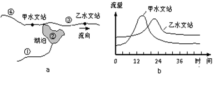 4、单选题  图示意某流域水系分布(a)和该流域内一次局地暴雨前后甲、乙两水文站观测到的河流流量变化曲线(b)。读图,完成题。