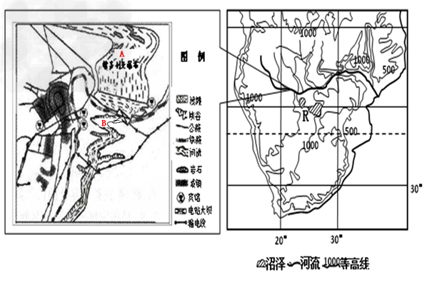 (2)图中R区域的两片沼泽在不同季节会出现分合变化的现象,请说明原因。
