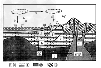 环示意图,其中①②③代表三大类岩石,字母代表水循环或岩石圈物质循环的各环节。读图完成1~3题。