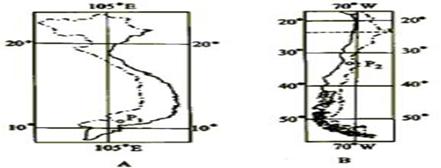 (3)A图、B图所示都是狭长型的临海国家,导致两国气候差异的主要因素是?