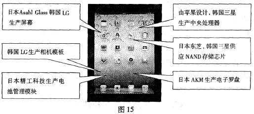 2、单选题 美国“苹果”公司是一家高科技信息技术公司,图15表示“苹果”公司生产的平板电脑(ipad2)的主要零部件产地。回答问题。