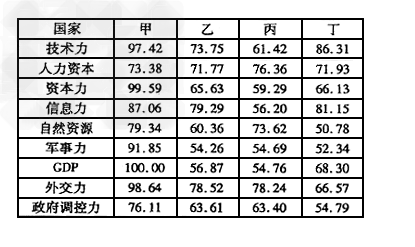 材料二 世界四个大国综合国力各类指标得分情况