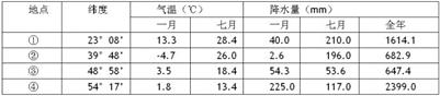 1.表中四地位置,可能的是2.④地降水特别丰沛的主要原因是3.下列关于②、③两地地理事象的叙述,正确的是