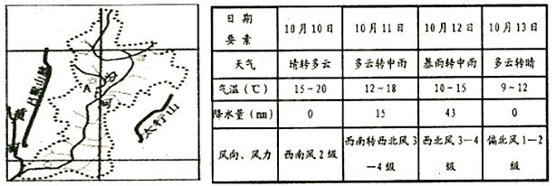 (3)根据表格信息可知,A城市风向西南风转为西北风,风力加大,出现强降雨天气,天气系统过境后与过境前相比,气温明显下降,所以据此可知判断该天气系统为冷锋。