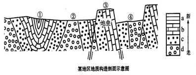 (1)图中①、②、③三处,在地质构造上属于向斜的是 。在地形上,该处为 ,向斜成为这一地形的主要原因是 属于背斜的是 在地形上,该处为 ,背斜成为这一地形的主要原因是 。