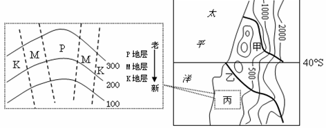 5、单选题  下图为世界某区域等高线地形图。左图为丙区域的放大图,其中实线为等高线(单位:米),虚线为地层界线。据此回答下列各题。