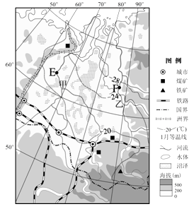 小题1:读图可知,该地区位于俄罗斯地区。图中等温线分布的主要因素是纬度;甲河下游沿岸为广阔的亚寒带针叶林带;乙河流经地区,由于纬度高,结冰时间长,航运条件差;EF两处虽然纬度差不多高,但是由于E处受西风带影响更大,所以较F处温暖一些,春季河水融冰时间早一些。