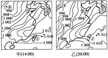 2、乙图所示时刻的①②③④地点中,风力比甲图明显加大的是