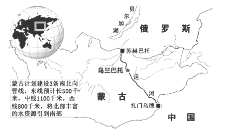 材料二:蒙古国深居亚欧大陆腹地,地形比较单一,平均海拔1600米。蒙古国提出“北水南调”计划,先在蒙古境内的北部边城苏赫巴托尔附近处筑一道10米高的拦水大坝,将色楞格河等河水堵截在蒙古境内,使之形成一个巨大的湖泊,然后引至扎门乌德(下图)。