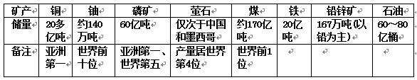 材料一:蒙古国经普查探明有80多种矿物,下面表格是蒙古国部分矿产的储量。