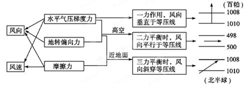 本题解析:水平气压梯度力是 形成风的原动力,决定了风的大小与去向。地转偏向力只改变风向不影响风速。摩擦力减小风速,影响风向。在三种力的共同作用下风与等压线斜交。