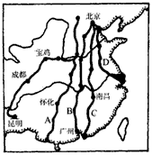 3、单选题 下图A、B、C、D四条铁路,表示京九铁路的是