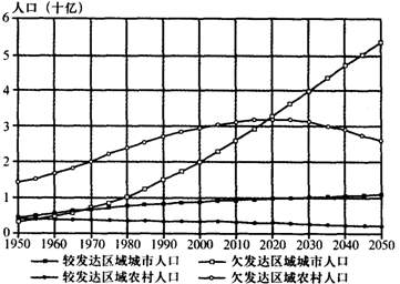 1、单选题 图反映了世界较发达区域、欠发达区域1950—2050年城市和农村人口发展(含预测)情况。读图,完成下列各题。