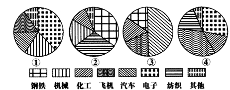 3、单选题  图3是西安、加尔各答、慕尼黑、底特律四个城市工业结构图,读图3回答10—11题。