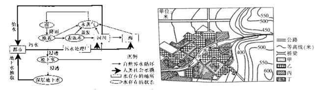 1.假设图中功能区布局合理,则图中甲、乙、丙、丁四个功能区分别是2.城市化过程影响着地理环境,在城市水循环系统中,最不活跃的环节是