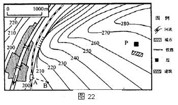 3、综合题 (6分)读某地区等高线地形图(图22),完成下列问题。