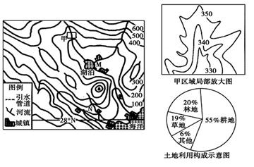 4、综合题 该图为我国某区域等高线地形图及该地区土地利用类型构成示意图。读图,分析回答问题。(12分)