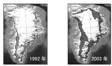 1、单选题  下图是1992年和2003年格陵兰冰原面积对比图。读图回答(1)~(2)题。