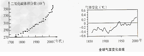 1、综合题 下图为“全球二氧化碳体积分数变化和全球气温变化曲线图”,回答问题: