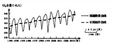 4、多选题 下图为“1993~2003年西伯利亚(即亚洲北部)沙果特湿地上空(1千米高度)空气样中CO2含量的变化观测统计图”。读图完成问题。