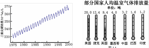 材料二:大气二氧化碳浓度的变化图(下左图) 材料三:部分国家人均温室气体排放量图(下右图)