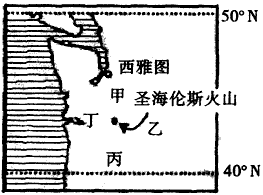 ? 下图是太平洋沿岸北部简图。1980年5月18日早晨,落基山脉的圣海伦斯火山爆发,火山灰烟蔽天空,高温空气使大量冰川熔化并摧毁无数生物。据此并读图,完成1—2题。