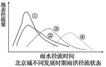 5、单选题 下表表示北京市城市与郊外的水循环相关数据,下图表示北京城不同历史时期雨洪径流变化状态图,读图表回答下列问题。