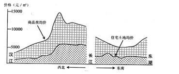 2、单选题 下图是我国某城市的长江两岸城区商品房均价与住宅土地均价剖面示意图,读图完成下列1—2题。