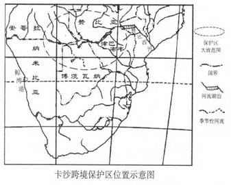 1、综合题 (28分)2011年,非洲安哥拉、博茨瓦纳、纳米比亚、赞比亚和津巴布韦等五国首脑共同签署了一项国际合作协议,计划各国携手建立一个号称世界上最大的自然保护区——卡沙跨境保护区。根据下列材料,结合所学知识,完成(1)?(4)题。