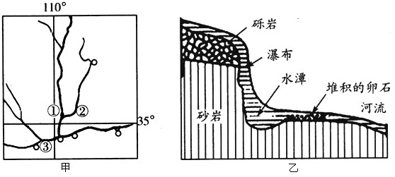 3、综合题 某校兴趣小组查阅资料,在图甲中①处有一瀑布,这样写道:"激流翻滚,惊涛怒吼,其声方圆十里可闻,其形恰如巨壶倒悬,场面极为壮观"。读图,回答下列问题。