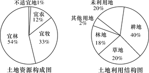 1、单选题 近年来,土地问题日益受到中国政府和社会各界的关注,也成为2010年两会上的热点问题。读“我国某省土地资源构成和利用结构图”,完成各题。