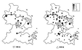 1、单选题 读长江三角洲地区的城市发展图(图中黑圆圈代表城市等级),回答35~36题。