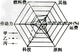 下图中甲、乙、丙反映了三类工业的投入构成情况,据此完成1 ~2 题。