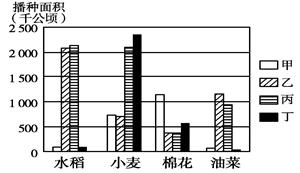 1.此题最好用排除法,甲的种植面积最大的是棉花,乙种植面积最大的是水稻,油菜也有较大面积的种植,应位于南方地区,可排除D,丙是水稻和小麦,可以排除C,丁是小麦,就河北和新疆来说,新疆对应是棉花,河北为小麦,正确答案选A。