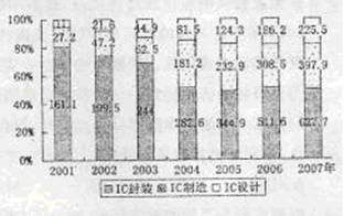 1、单选题 IC产业(集成电路产业)是电子信息产业的基础,一般。由设计、制造、封装三个环节构成,珠江三角洲和长江三角洲地区是我国最重要的比产业基地。读“2001—2007年我国IC产业产值(亿元)结构变化图”,回答下题。