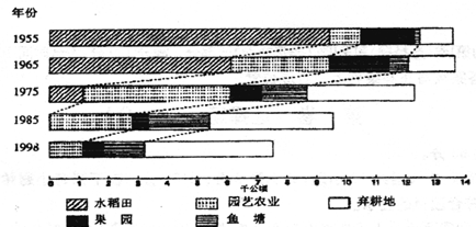 1.1955年,香港农业生产的最主要地域类型属于2.1975年至1998年,香港地区弃耕地比重大幅上升的原因有
