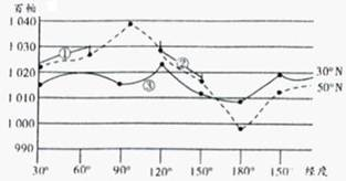 5、单选题 图反映的是某月30°N附近气压分布状况,回答题。