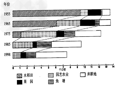 1、单选题 读香港农业土地利用变化图,回答 1-2题。