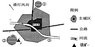 1、填空题  下图为我国某城市示意图,①是电子信息工业园区,周围有众多的高等院校,②是钢铁厂。据此完成下列问题。(10分)