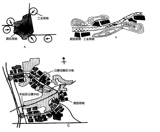 (2)A;用地集中;可设置较为完整的生活服务设施,方便居民生活,便于行政领导和管理,节省投资。?