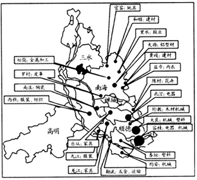 2、单选题 下图为佛山市工业分布图。读图完成1~2题。