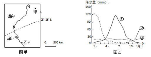 5、单选题 图甲中甲地气温年较差约为13℃,乙地气温年较差约为9℃。图乙示意三地年降水量及其年内变化。读图甲、图乙,完成各题。